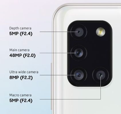 - Pros of SAMSUNG GALAXY A31 have quad main camera at back side body with 48 MP f/2.0 for standard wide + 8 MP f/2.2 for ultrawide + 5 MP f/2.2 for macro + 5 MP f/2.2 for DOF. Macro can be use for take very detail photos at short distance.